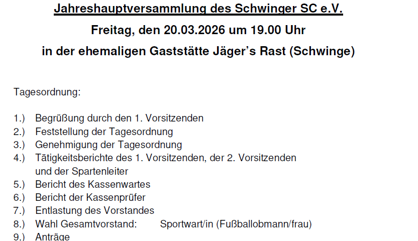 Wir möchten unsere Vereinsmitglieder und selbstverständlich auch Gäste zu unserer diesjährigen Jahreshauptversammlung des Schwinger SC am Freitag, 20. März 2026, um 19.00 Uhr ins „Jägers Rast“ in Schwinge einladen. Neben einem Rückblick auf das vergangene Jahr und einem Ausblick auf geplante zukünftige Aktivitäten steht die Wahl folgender Position im Gesamtvorstand